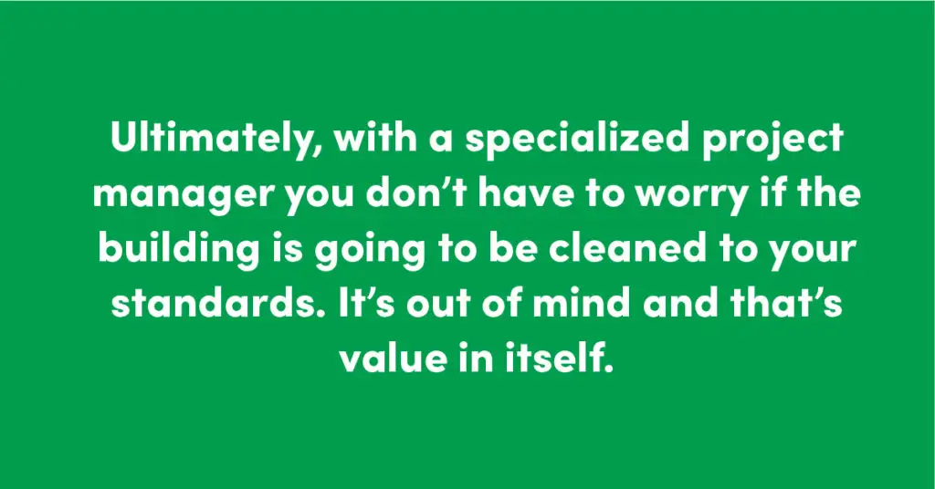 Ultimately, with a specialized project manager you don’t have to worry if the building is going to be cleaned to your standards. It’s out of mind and that’s value in itself. Check out this article to better understand how trained crews also save you time and money.