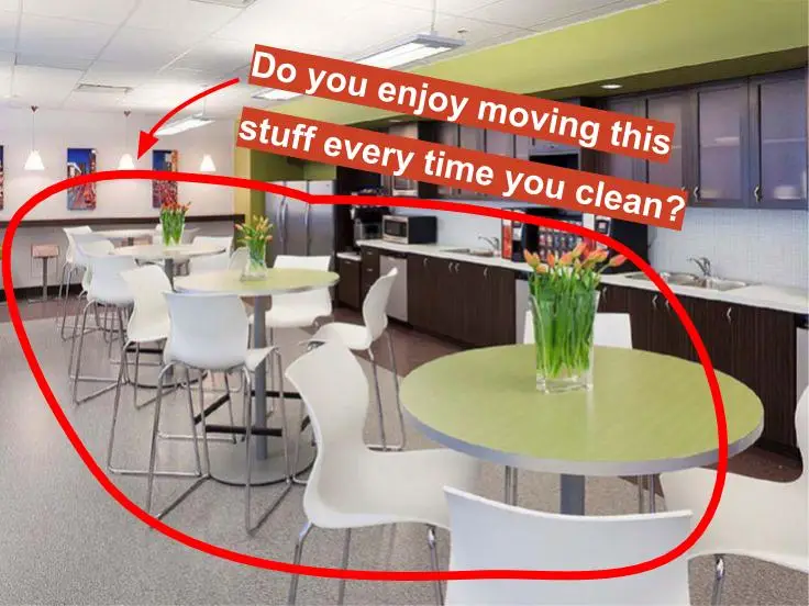 Think about all of the stuff you have to move (or work around) BEFORE you clean. Chairs, tables, desks, storage shelving, equipment. The list goes on and on!